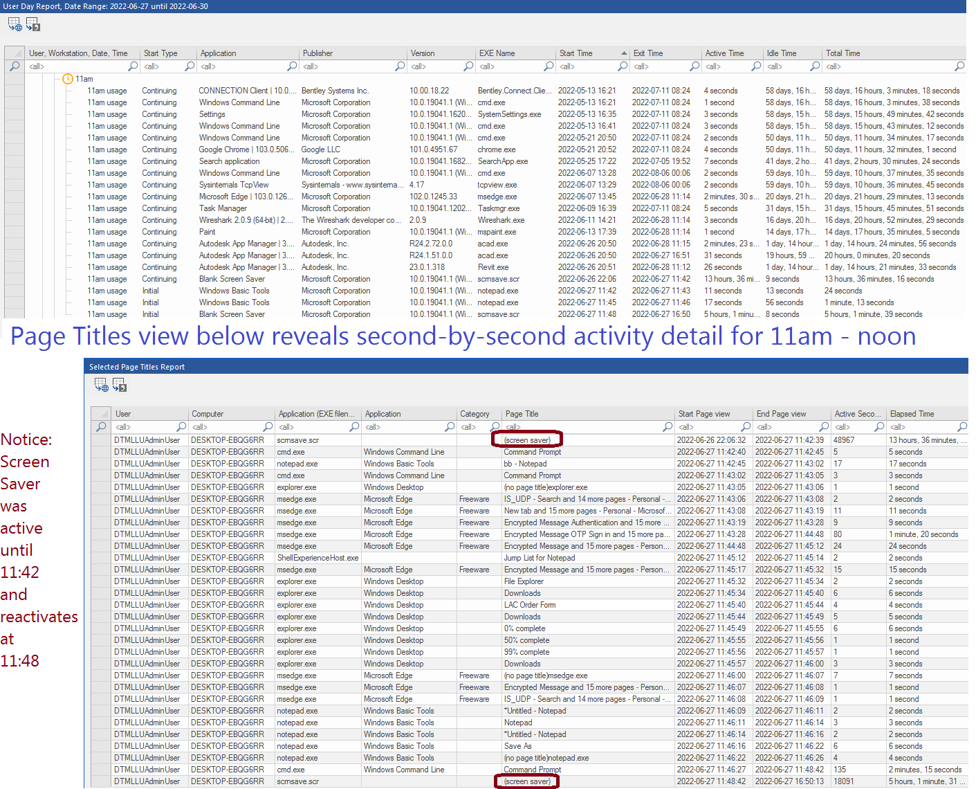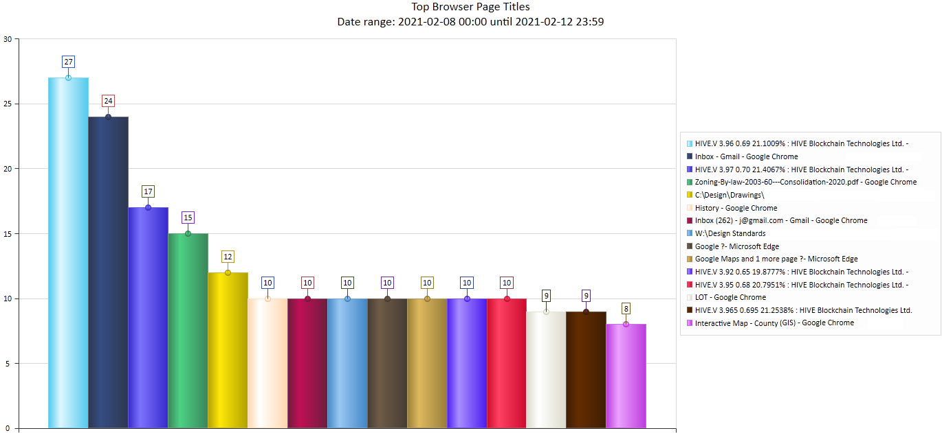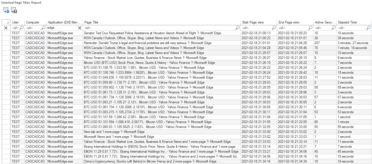 The following image shows Window Caption/Page Titles of the browser Microsoft Edge the user had opened and time spent viewing.