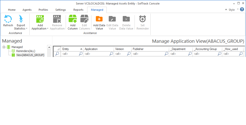 The following image from the SofTrack Console shows a Managed Application View with custom columns