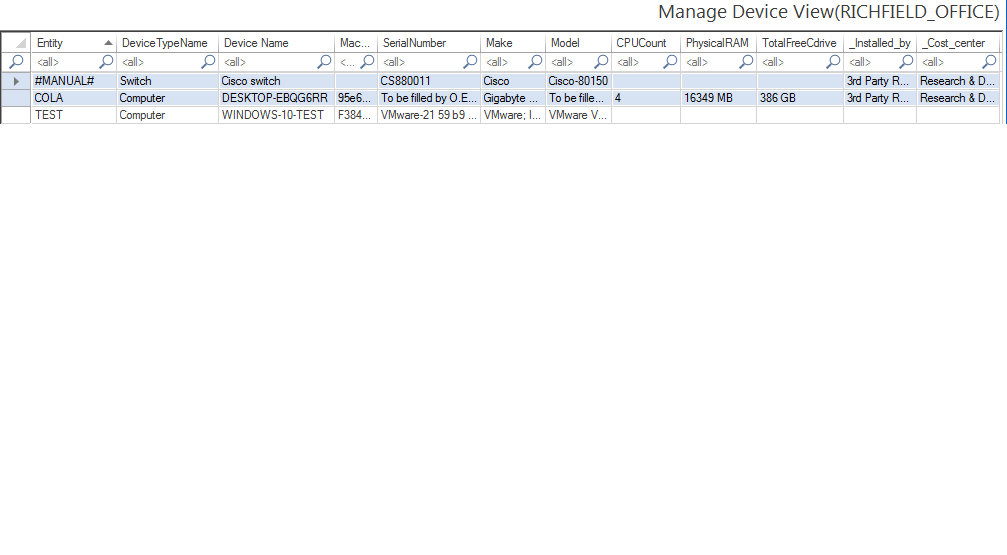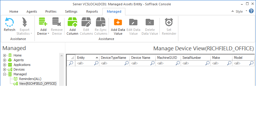 The following image from the SofTrack Console shows a Managed Device View with default columns