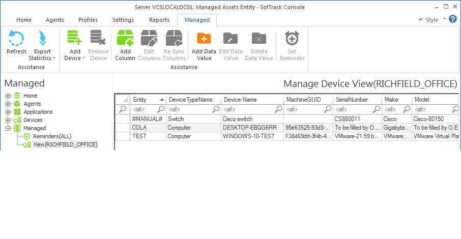The following image from the SofTrack Console shows a Managed Device View with custom columns and data.