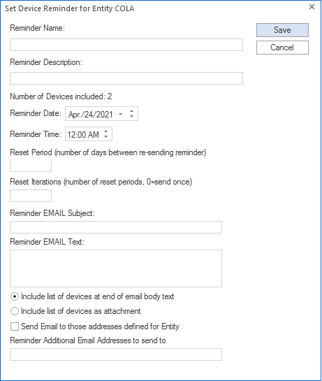 The following image from the SofTrack Console shows creating a new Device Email Reminder configuration.